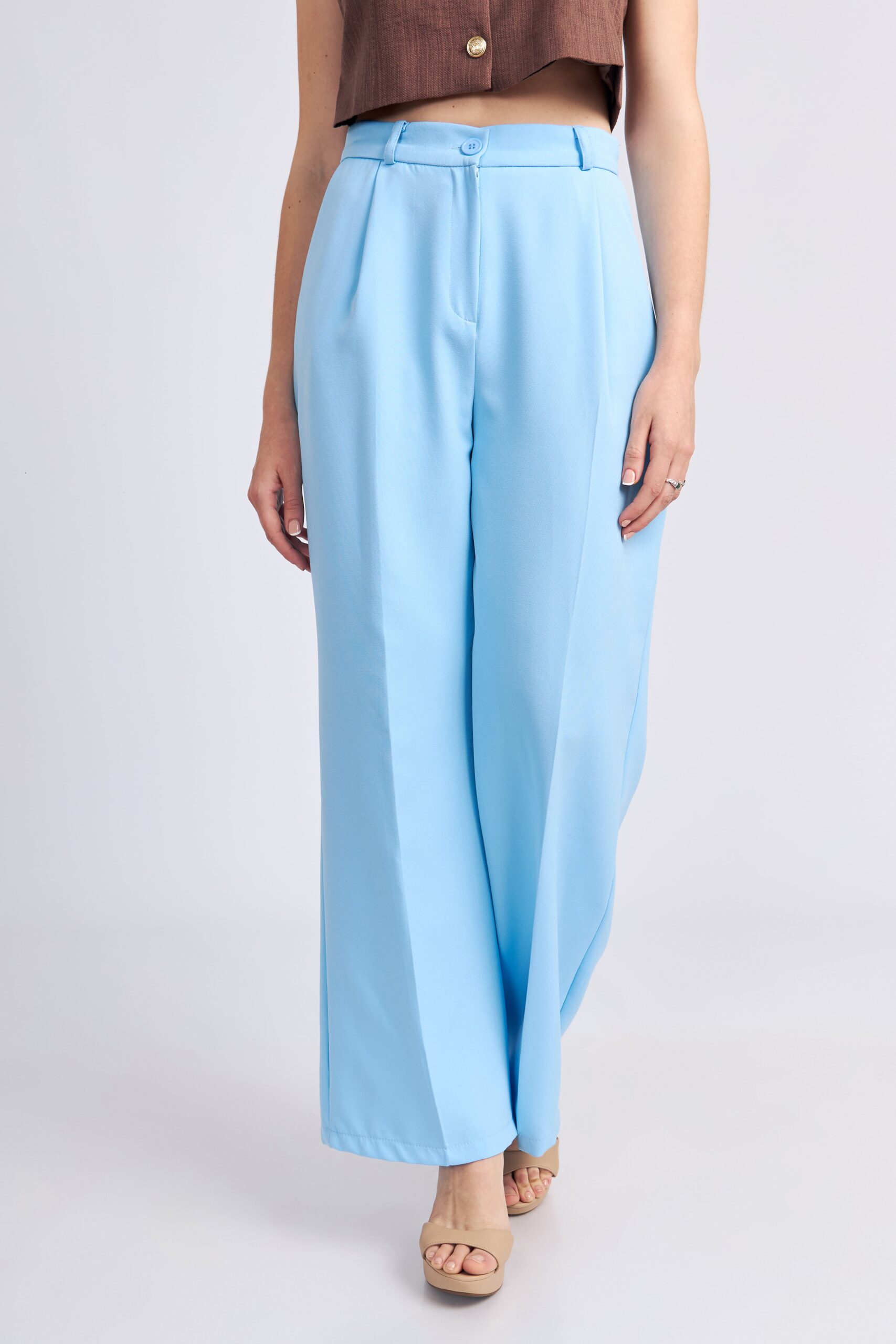Pantalón palazzo celeste de tiro alto, con pinzas suaves y caída fluida.